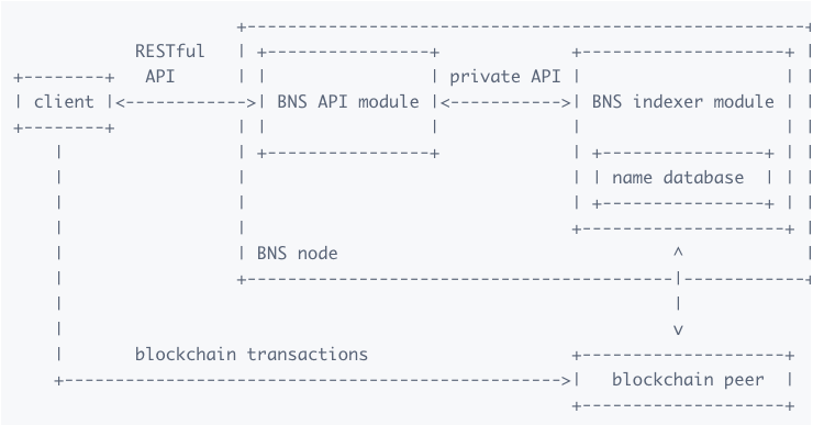 上図は BNS 構造を表している。クライアントは名前解決し、ブロックチェーントランザクションを発行するために BNS API モジュールと会話する。API モジュールは インデクサーモジュールと会話し、クライアントに名前解決のための安定した Web アクセス可能なインターフェースを与える。インデクサーモジュールはブロックチェーンのピアを通してブロックチェーンを読む。